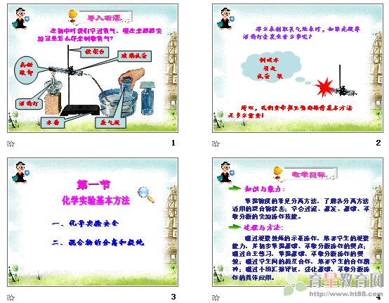 共64张,主要展示了导入新课、教学目标、化学实验安全、混合物的分离和提纯、有讲有练,可用于该内容教学展示。