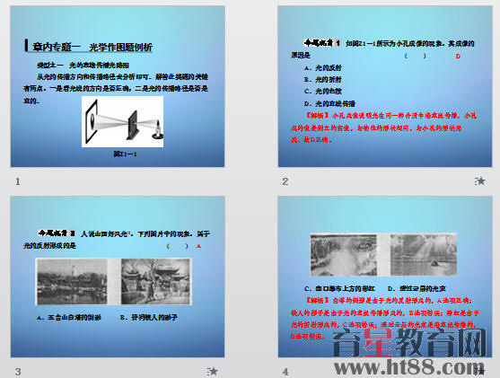 共79张,主要展示了光的直线传播光路图、光的反射现象光路图、光的折射光路图、透镜光路图、可用于光学作图专题复习展示。
