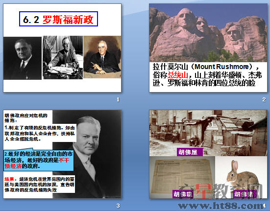共49张,新政实施背景,新政的实施,举办救济和公共工程,建立社会保障体系,罗斯福新政影响、意义、评价。
