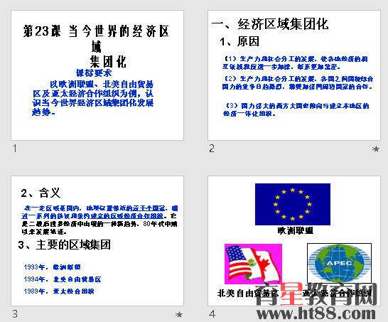 共39张,主要展示了经济区域集团化、欧洲联盟的建立、北美自由贸易区、有讲有练,可用于该内容教学展示。
