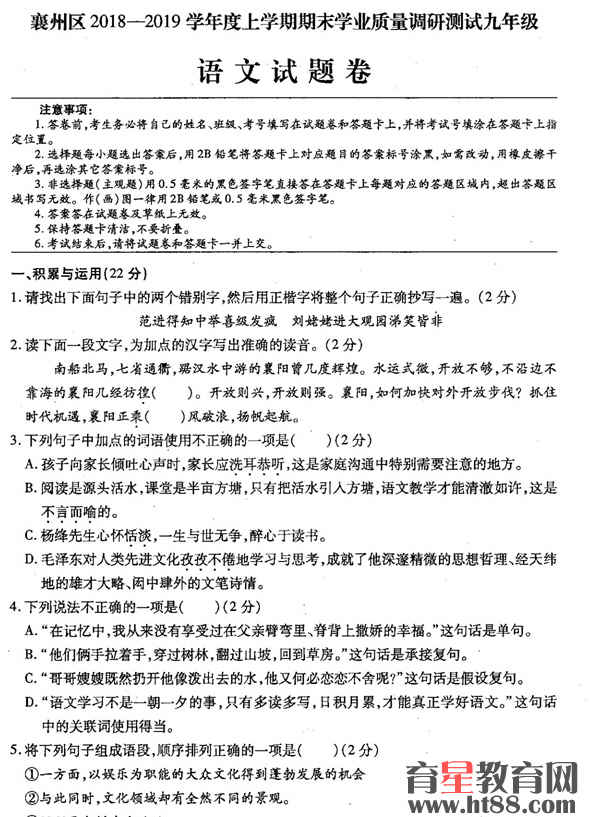 湖北省襄阳市襄州区2018-2019学年度上学期期末学业质量调研测试九年级语试题(扫描版)