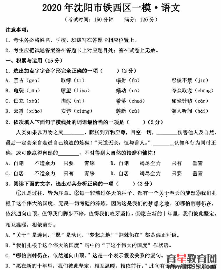 2020年辽宁省沈阳市铁西区中考一模语文试卷(PDF版)