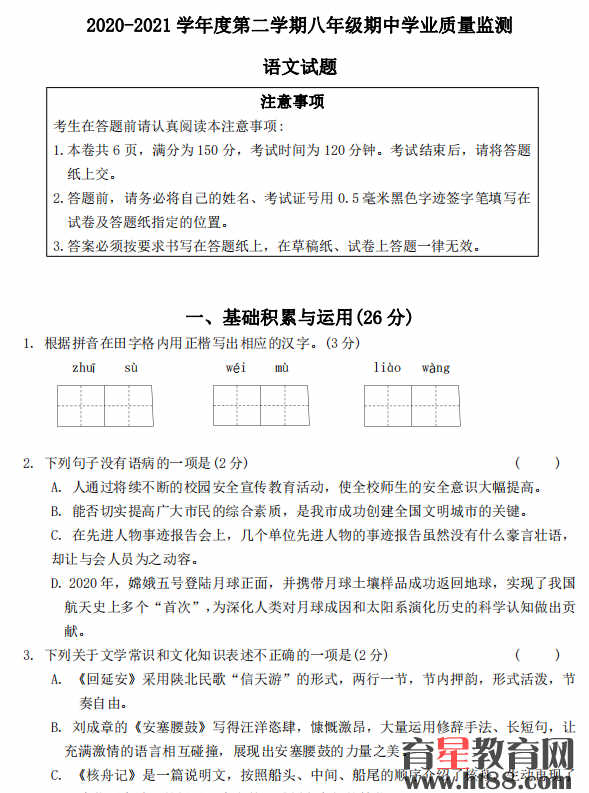 江苏省南通市2020-2021学年度第二学期八年级期中学业质量监测语文试题(PDF版)