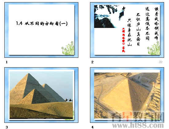 从不同的方向看,课件取材来自于生活,让学生感受身边的数学,从而提高学习兴趣,适合新课教学。