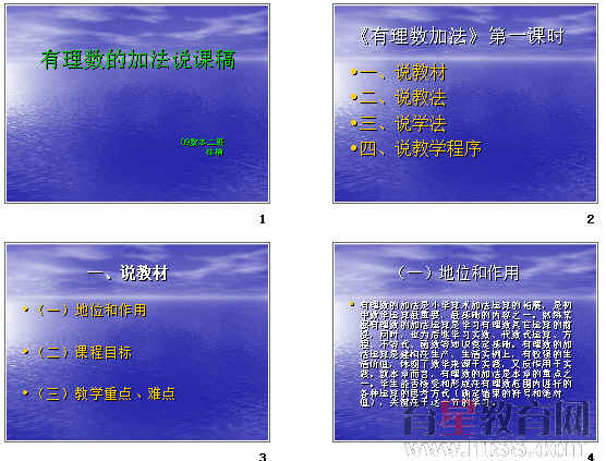 有理数的加法的说课课件,有说教材、说教法、说学法、说教学程序等环节,分析详细,适合说课使用。